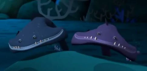 Gulper Eels are flat spade-shaped creatures with skinny tails and a large mousetrap-like mouths. There are small fins on their bodies. One of them is navy blue, while the other is violet. Small teeth stick up from their mouths, trapping the prey.