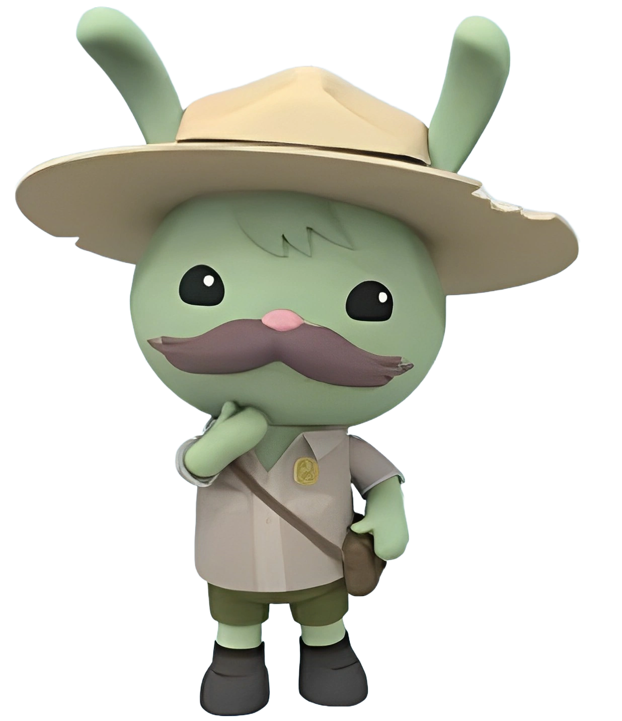 Ranger Marsh is a green rabbit with a beige explorer uniform and hat, which has small bite markings on the right side-front and the rear. He has a small bundle of hair coming down, and has black eyes like all the other Octonauts as well. He has a pink button-shaped nose and a brown moustache. He wears forest-green shorts and a pair of light-black boots. A small pouch is slung over his shoulder and goes down to his waist. He is often shown with an optimistic expression upon his face. In The Cold Snap, he wears a snow suit similar to that of the crew's, but it's brown instead of blue.