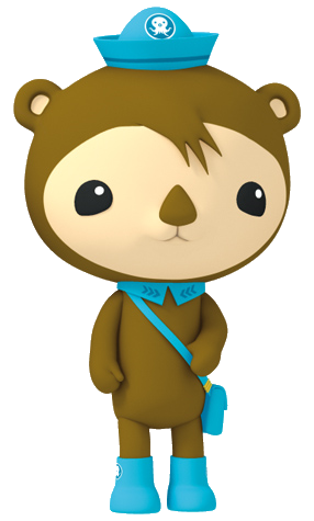 His fur is brown, with three tufts of spiky fur hanging down over his forehead, and a sand-colored face. He has a brown nose and small round brown ears with sand coloured insides. Of all the Octonauts, he is the only one, other than Peso, who has a mouth that doesn't have a peanut-shaped muzzle.